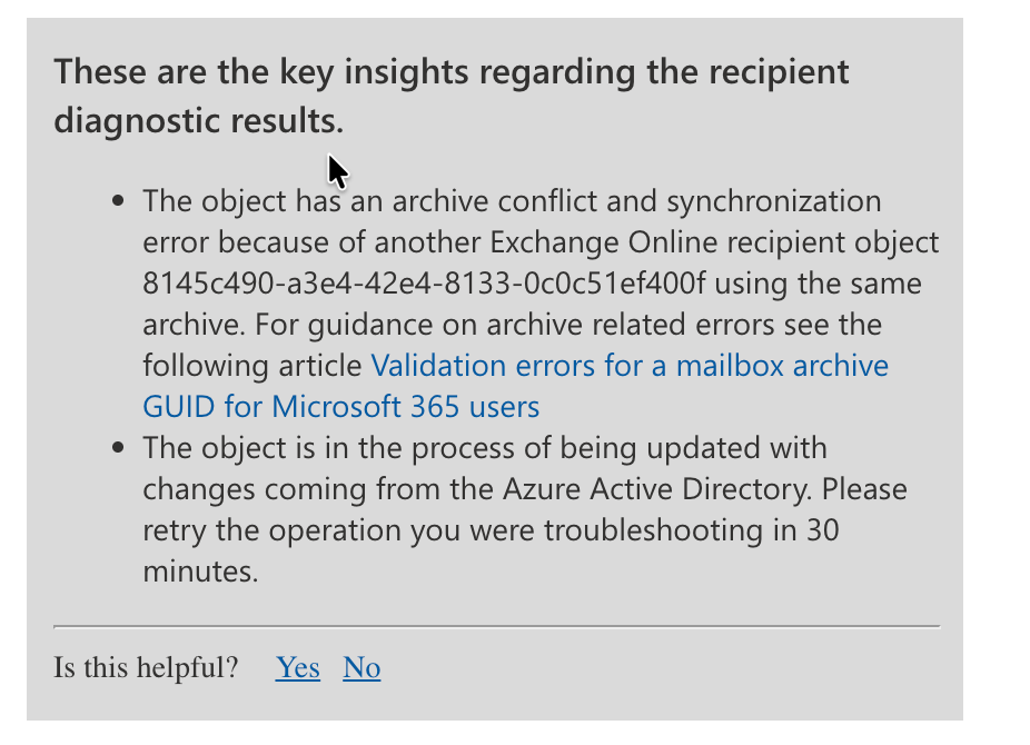 The sneaky part: it can say “no errors” while ArchiveGuid is blank in EXO. That’s not a clean result - that’s the symptom. It means Entra ID has the attribute but it’s not making it to Exchange Online. The error variant is actually easier to work with - at least it points you somewhere.