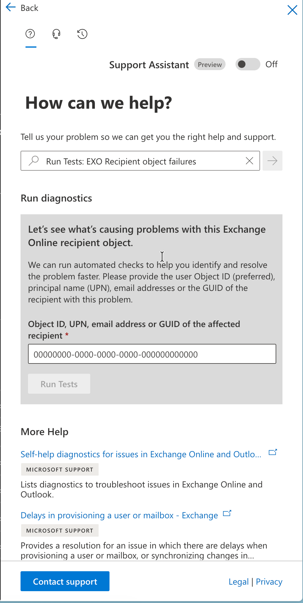 The tool asks for an Object ID, UPN, email address or GUID of the affected recipient. Feed it the user’s Object ID from Entra ID and it runs automated checks against the provisioning state from EXO’s perspective in seconds.